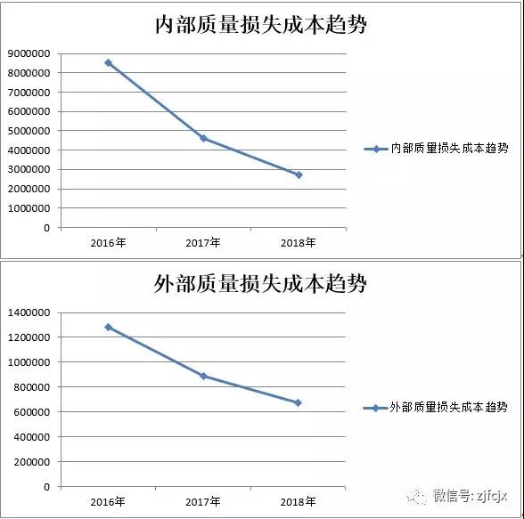 在2017年建立公司質量成本統計核算系統以來,質量損失事件及不合格產品造成的質量損失成本數據進行了有效的收集、統計、分析、匯總,2018年,質量損失成本管理的持續化,及對質量損失成本分析數據的有效應用,最終得到了豐厚的回報,根據質量損失成本的排列圖分析,而確定的涂裝生銹、涂裝油點的改進;針對鈑金工藝的滾圈、擴口開裂的報廢損失的改進,最終使本公司的內部質量損失成本,由2016年的850萬下降到2018年的273萬;外部質量損失成本由2016年的128萬,下降到2018年的67萬。